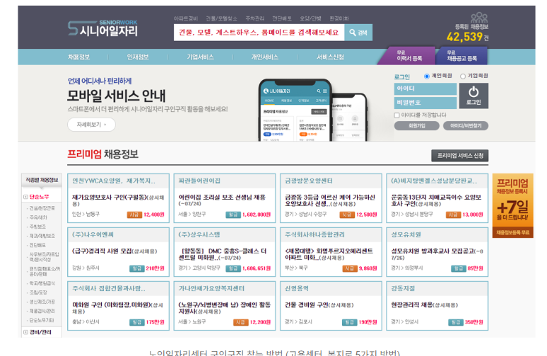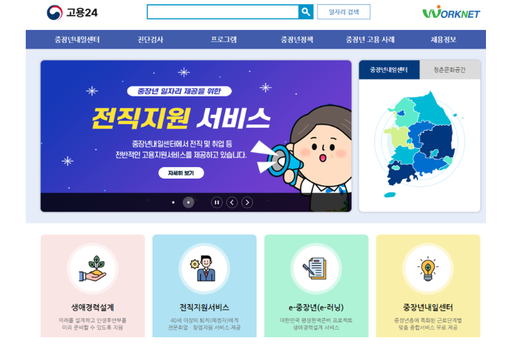 한국고용정보원이 운영하는 사이트로, 중장년층(노인 포함)을 위한 일자리 정보와 경력설계, 전직지원 서비스까지 제공해요. - 시니어일자리 구인구직
