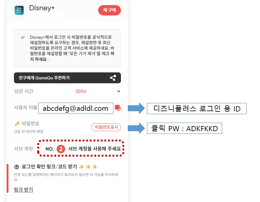 아래의 사용자 이름과 비밀번호가 디즈니플러스용 로그인 정보입니다.