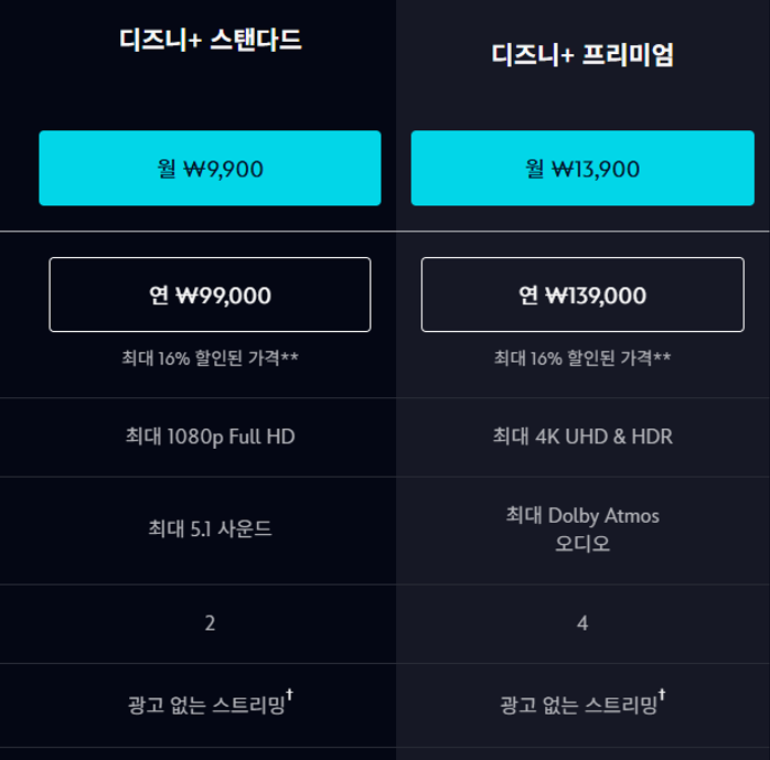 디즈니플러스는 아래 두 가지 요금제를 제공합니다.