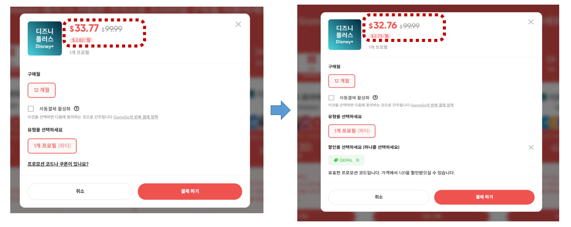 아래는 실제로 디즈니플러스를 3,000원대에 구독하는 과정입니다.