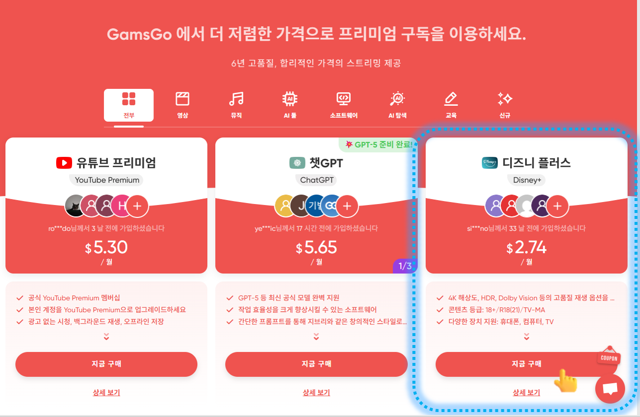 겜스고에서는 디즈니플러스 외에도 다음과 같은 서비스들을 저렴하게 제공합니다.