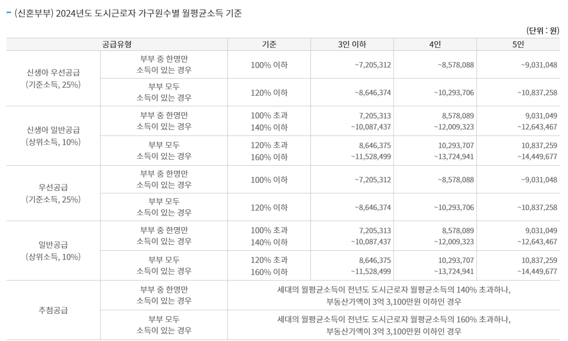 | 우선공급 (기준소득) | 외벌이 100% 이하 | ~7,205,312 | ~8,578,088 | ~9,031,048 |